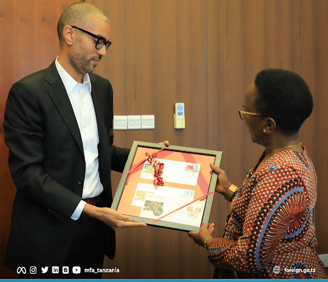 Waziri wa Mambo ya Nje na Ushirikiano wa Afrika Mashariki Balozi Liberata Mulamula akipokea zawadi ya picha kutoka kwa Bw. Ahmed Salim mtoto wa Dkt. Salim Ahmed Salim ambaye alikabidhiwa na Serikali ya China ikiwa ni ishara ya kuutambua mchango wa Dkt. Salim ulioiwezesha China kurejesha kiti cha Kudumu katika Baraza la Usalama la Umoja wa Mataifa mwaka 1971 |