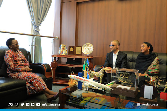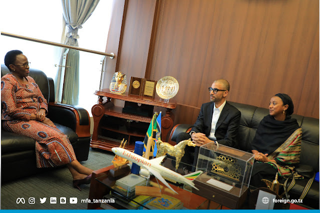 Waziri wa Mambo ya Nje na Ushirikiano wa Afrika Mashariki Balozi Liberata Mulamula (kushoto) akizungumza na Bw. Ahmed Salim (katikati) mtoto wa Dkt. Salim Ahmed Salim ambaye alifika katika Ofisi ndogo za Wizara jijini Dar es Salaam kumkabidhi zawadi ya picha iliyotolewa na Serikali ya China ikiwa ni ishara ya kutambua mchango wa Dkt. Salim ulioiwezesha China kurejesha kiti cha Kudumu katika Baraza la Usalama la Umoja wa Mataifa mwaka 1971