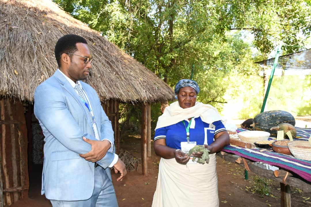 Mkurugenzi Mkuu wa Makumbusho ya Taifa, Dkt. Noel Lwoga akionyeshwa jambo na Mama wa kimila Bi. Elda P. Maka wakati alipotembelea katika Maonyesho ya Kimataifa ya 46 ya Biashara maarufu kama Sabasaba yanayoendelea katika Viwanja vya Mwl. Julius Kambarage Nyerere jijini Dar es Salaam