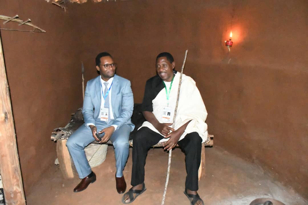 Mkurugenzi Mkuu wa Makumbusho ya Taifa, Dkt. Noel Lwoga akiwa amekaa na kuzungumza na Mzee wa kimila Willy B. Nyamtiga wakati alipotembelea katika Maonyesho ya Kimataifa ya 46 ya Biashara maarufu kama Sabasaba yanayoendelea katika Viwanja vya Mwl. Julius Kambarage Nyerere jijini Dar es Salaam